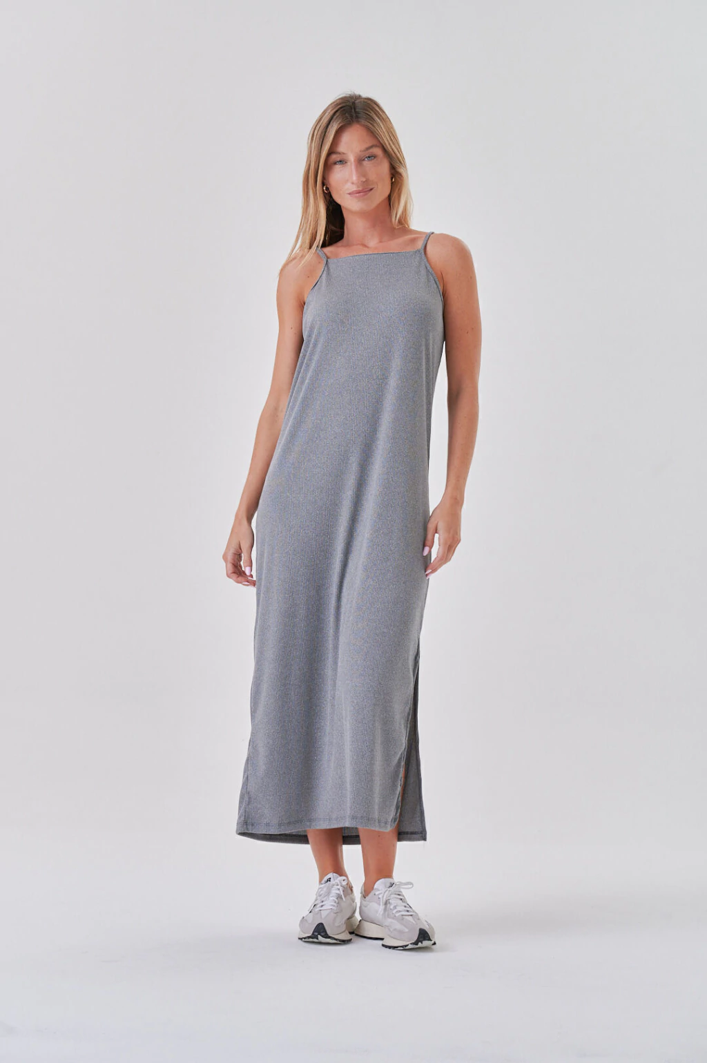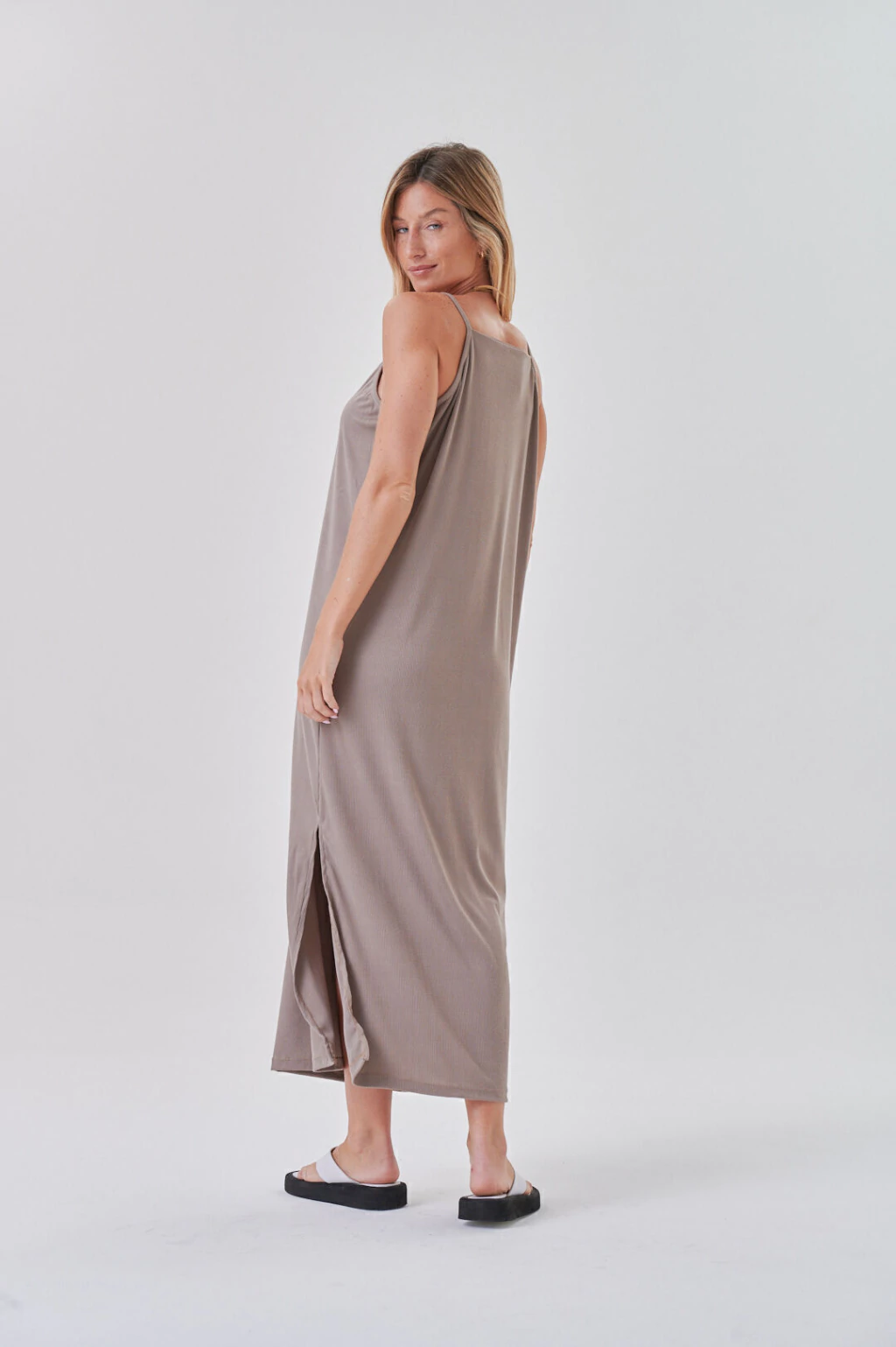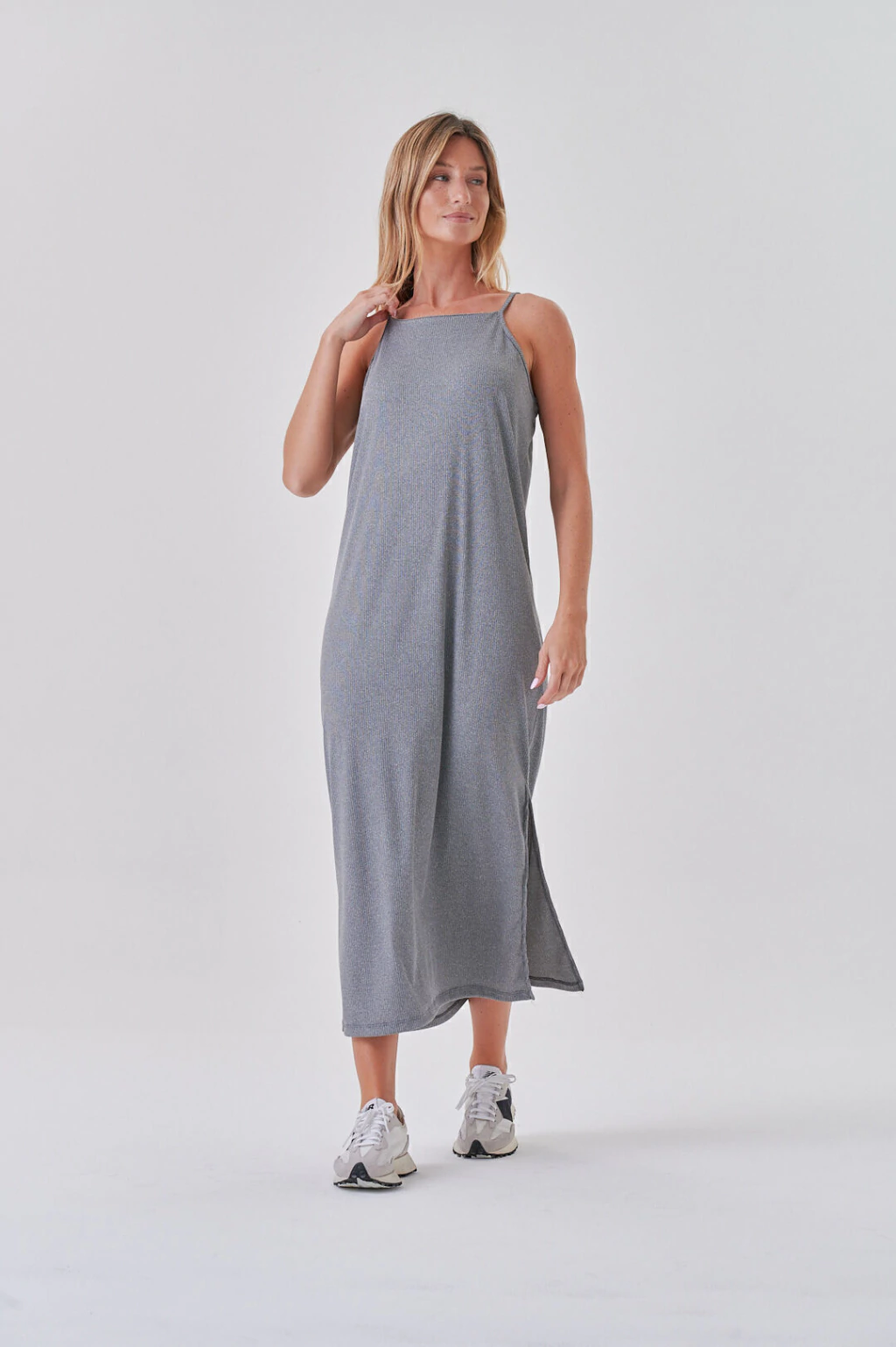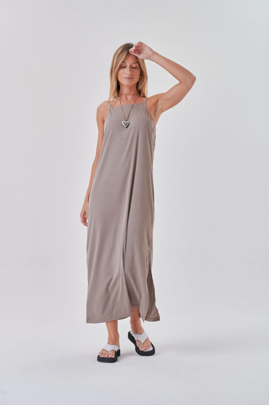 Es un vestido de morley no adherente, largo, tiene un tajo Y bretel fino.