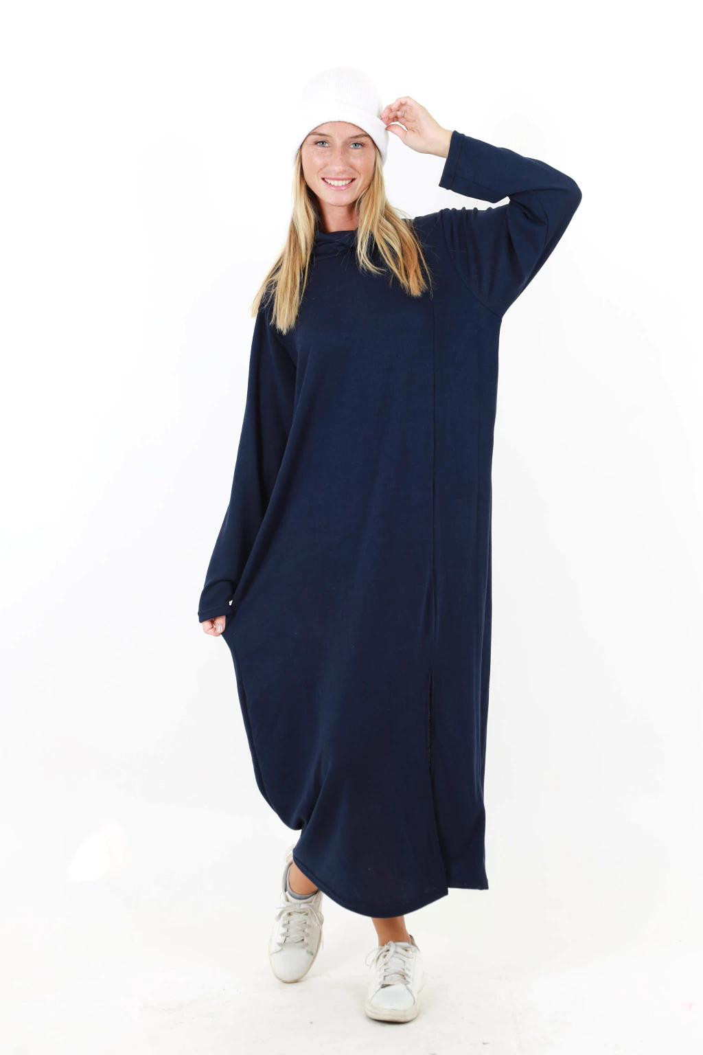 El vestido largo, manga larga con cuello volcado! Es un modelo oversize.